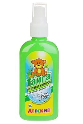 Для детей в возрасте от двух лет предназначен отдельный репеллент - спрей "Тайга". Он защищает малышей от укусов комаров и мошек, других кровососущих насекомых. Спрей можно наносить как на ткани (одежду, шторы, москитные сетки), так и непосредственно на кожу ребенка, соблюдая инструкцию на упаковке. Не оставляет пятен на тканях, не вызывает раздражения, содержит гидролат лекарственной ромашки. Удобен для обработки больших поверхностей. Хранить в сухом месте. Состав: вода 30%, N,N-диэтил толуамид 7%, пропиленгликоль 30%, гидролат ромашки лекарственной 5%, консервант.