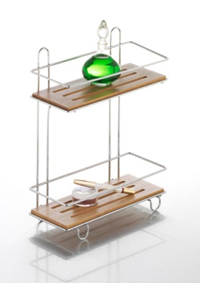 Полка для ванной Axentia 282091 - подвесная двухуровневая. Крепится к стене шурупами. Произведено из стального сплава, покрытого хромом, и бамбукового дерева.