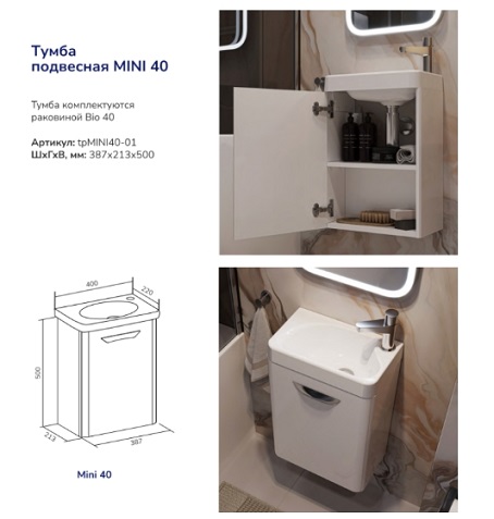 Тумба подвесная Mini 40 с умывальником Био 40 VOLNA