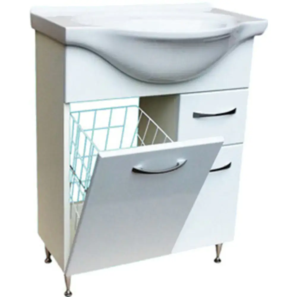 Тумба напольная под умывальник СанитаМебель Камелия-65.12к Д2 Умывальник не входит в комплект. Cлева за откидной дверью - корзина для белья; справа - 1 выдвижной ящик на роликовых направляющих и распашная дверь. Тумба крепится к стене через отверстие в бруске.