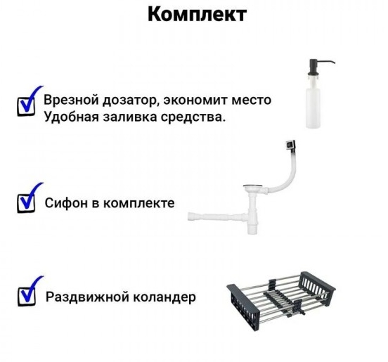 Мойка кухонная PROMO WS-35044BD+GER013 с сифоном, дозатором и коландером Wisent