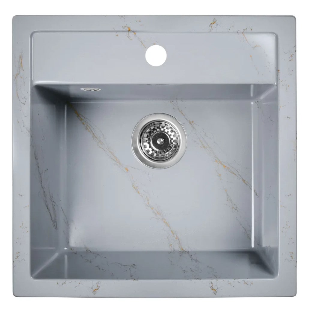 Мойка кухонная WA11-15, серое-золото без сифона, Wisent Мойка для кухни из искусственного камня WISENT WA11-15 выполнена в красивом сочетании серого цвета с золотыми тонкими прожилками, мойка с глубокой чашей и симметричными сторонами имеет оптимальный размер и позволяет разместить несколько комплектов посуды. Мойка без крыла имеет готовое отверстие для смесителя Ø35 мм. Раковина изготовлена из композитного материала "Искусственный гранит" Состав материала: 80% гранитная крошка, 20% полимерные связующие. Данная смесь природных материалов позволяет достичь максимальной прочности моек, их износостойкости и долговечности.
