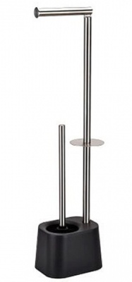 Стойка для туалета напольная. Комплект: держатель для туалетной бумаги, полочка для телефона и щетка для унитаза. Произведено из нержавеющей стали. Поверхность глянцевая. Подставка и полочка черного цвета, изготовлены из пластика.