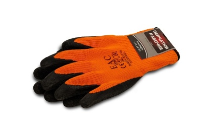 Материал: ПОЛИЭСТЕР, 10 НИТЕЙ, ЛАДОНЬ ПОКРЫТА РЕЗИНОЙ (ЛАТЕКС, 3/4). Оранжевая полиэфирная подкладка 10 калибра, перчатки с черным латексным покрытием, с морщинистой отделкой, вес латекса составляет 57 г (67%), вес подкладки из полиэстера без латекса составляет 28 г (33%). Толщина - 1,10 мм.