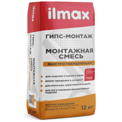 Смесь монтажная быстротвердеющая Гипс-монтаж ILMAX, 12 кг предназначена для изготовления гипсовых строительных, декоративных изделий и при ремонтных работах: фиксации электрических розеток; крепления электропроводки; штукатурных маяков под гипсовые штукатурки; заполнения штраб, стыков, трещин, выбоин; для выравнивания поверхностей и устройства скруглений. Для ручного нанесения. Используется по следующим основаниям: бетон; цементные, цементно-известковые и гипсовые штукатурки; кладка из керамических, силикатных и керамзитобетонных изделий, гипсовых блоков и плит, блоков из ячеистого бетона. Внутри помещений с нормальным влажностным режимом эксплуатации, по вертикальным и потолочным поверхностям.