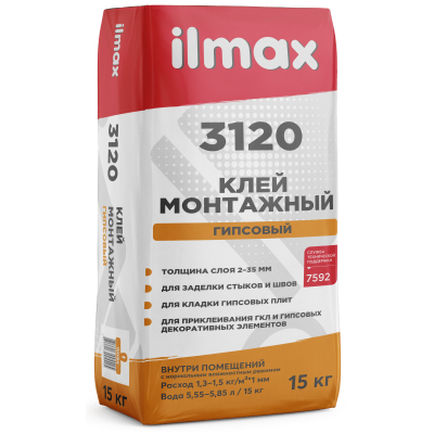 Клей гипсовый монтажный ILMAX 3120 15 кг предназначен для приклеивания гипсокартонных и гипсоволокнистых листов (в том числе для заделки стыков и швов между ними), штучных гипсовых декоративных элементов, а также для кладки и ремонта гипсовых плит. Для ручного нанесения.
