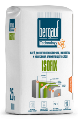 Клей для теплоизоляции Bergauf Isofix, 25 кг ЗИМА применяется для приклеивания тепло- и звукоизоляционных плит из минераловатного волокна и пенополистирола, а также для нанесения армирующего слоя. Используется для наружных и внутренних работ.