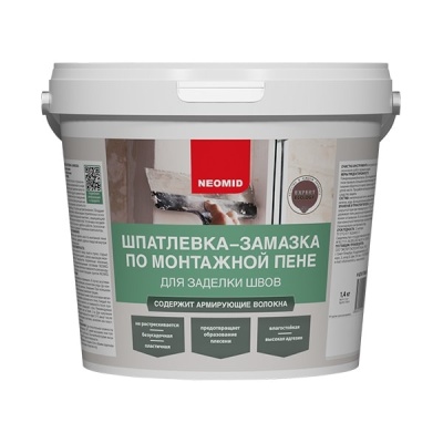 Шпатлевка-замазка для заделки швов по монтажной пене 1,4 кг НЕОМИД. Безусадочная готовая к применению шпатлевка на акриловой основе предназначена для заделки швов по монтажной пене и других ремонтных работ снаружи и внутри помещений. Входящие в состав армирующие микроволокна позволяют заполнять полости глубиной до 10 см без растрескивания. Обладает высокой адгезией к любым видам строительных оснований. Содержит биоцидный комплекс, защищающий от грибов, плесени и водорослей. Устойчива к воздействию влаги. Пластична и удобна в работе. Экологически безопасна, не содержит токсичных компонентов.