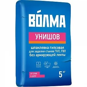Шпатлевка гипсовая для заделки стыков ГКЛ, ГВЛ без армирующей ленты, Волма Унишов - многофункциональная сухая шпаклевочная смесь на основе натурального гипсового вяжущего, модифицированная минеральными и химическими добавками, обеспечивающими высокую адгезию, водоудерживающую способность и оптимальное время работы. Прочная, армирована микроволокнами.