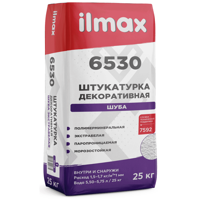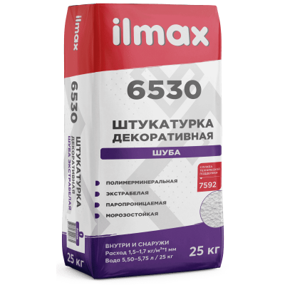 Штукатурка декоративная ILMAX 6530 ШУБА белая 1.0 мм, 25 кг предназначена для создания декоративных тонкослойных штукатурных покрытий с рельефной фактурой «шуба». Используется в качестве элемента декоративно-защитного слоя в легких штукатурных системах утепления, а также для наружных и внутренних отделочных работ по минеральным поверхностям (бетон, цементные и гипсовые штукатурки), ДСП, гипсокартону. ilmax 6530 проста в нанесении, не требует идеально ровной поверхности и хорошо укрывает небольшие дефекты основания.