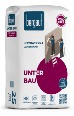 Штукатурка цементная Bergauf Unter Bau 25 кг для фасада и цоколя - штукатурка водостойкая, морозоустойчивая, на цементной основе. Рекомендована к использованию для фасадной отделки. Подходит для кирпичных, бетонных, железобетонных, ячеистобетонных поверхностей. Применяется как основа для облицовки плиткой, под окрашивание, оклейку обоями, декоративное оштукатуривание. Наносится вручную, и с применением специализированной техники.