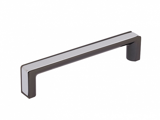 - Вставка из матового никеля и обрамляющие её линии основания ручки чёрного цвета создают интересное сочетание. На мебели с серым подтоном изделие почти незаметно.