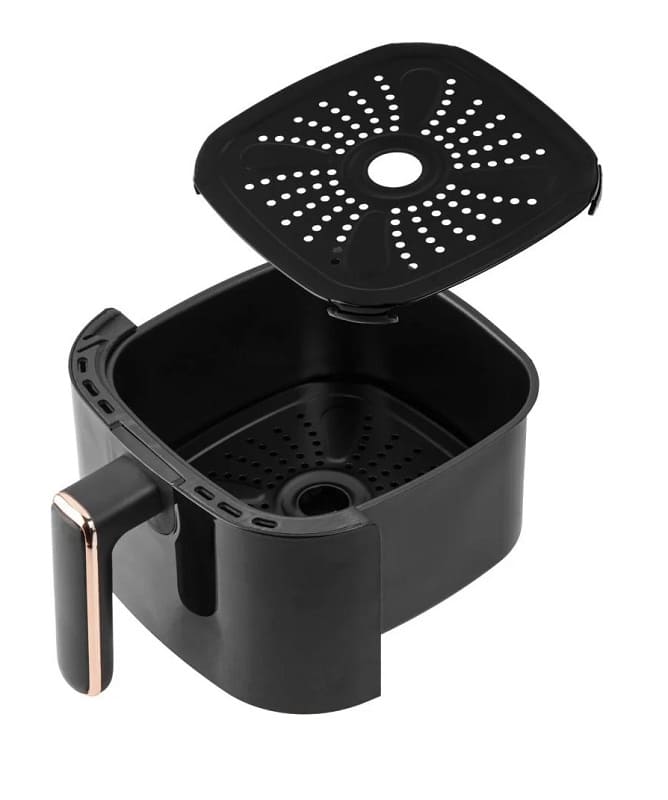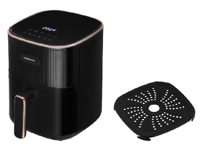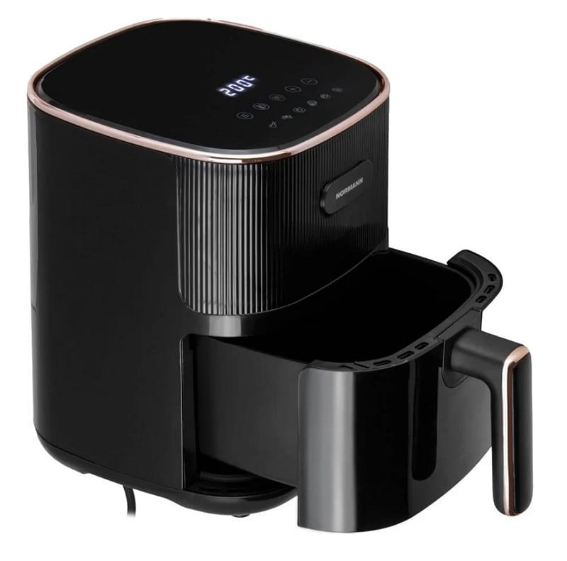 Аэрогриль Normann AAF-312 (N16028-1) имеет 6 автоматических программ приготовления, которые позволяют одним касанием приготовить популярные варианты завтрака, обеда, ужина или легкого перекуса. Горячий воздух циркулирует равномерно за счет применения ТЭН и 9-лопастного конвекционного вентилятора. Продукты подрумяниваются со всех сторон и остаются сочными внутри. Аэрогриль черный с золотистой окантовкой. Корпус выполнен из ударопрочного пластика. Чаша объемом 3 л с антипригарным покрытием и гриль-решетка легко очищаются под струей воды или влажной губкой. Умная пауза сохраняет настройки, когда вы достаете чашу в процессе выполнения программы. Перемешайте или добавьте специи и просто установите чашу на место - таймер продолжит отсчет до готовности. Аэрогриль с сенсорным управлением реагирует на легкое прикосновение и подмигивает иконками, подсказывая следующий шаг перед началом готовки. Температура регулируется от 80 до 200 °C с шагом 5 °C. Такой диапазон подходит для приготовления овощей, морепродуктов, мяса и выпечки. Точность настройки позволяет подобрать оптимальную температуру для каждого блюда. Максимальное время установки таймера 60 минут. Время приготовления, как и температуру, можно отрегулировать в процессе приготовления блюда: добавить минут или скорректировать жар. Если прибор закончил готовку и простаивает дольше 1 минуты, включается режим ожидания с минимальным потреблением электроэнергии. Многофункциональность аэрогриля AAF-312 в сочетании с компактными габаритами позволят освободить место на кухонном столе и готовить питательные блюда с минимальным количеством масла.