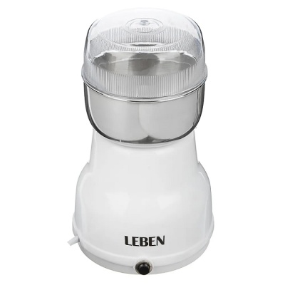 Кофемолка LEBEN 286-036. За один раз бытовой прибор измельчает до 50 г зерен. Чаша из нержавейки не вступает в реакцию с содержимым, не портит природный запах и вкусовые качества.