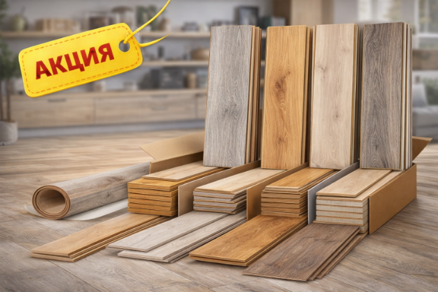 Ассортимент акционных товаров включает ламинат брендов Castello, Kastamonu, Floorpan, Swiss Krono, Mostovdrev, Europe Line и других производителей. Представлены модели с фаской 4V и без фаски, в разнообразных оттенках и текстурах под натуральное дерево: дуб тоскана, дуб каньон, дуб норвежский, дуб медовый, светлые и тёмные древесные декоры. Это позволяет легко подобрать напольное покрытие под любой стиль интерьера.